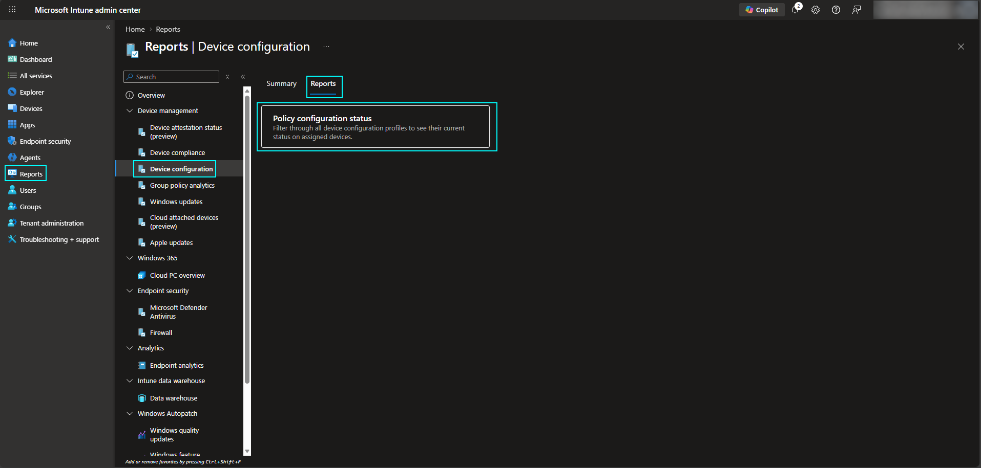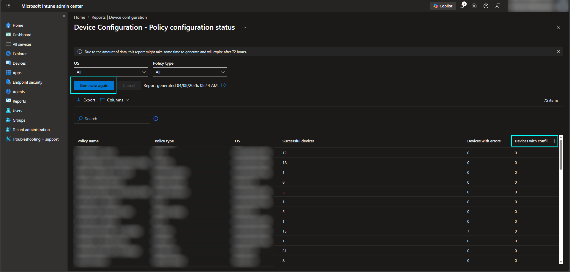 Generate the report and sort by Devices with conflict to quickly identify affected endpoints. This view is also useful for highlighting any errors associated with deployed configuration policies.