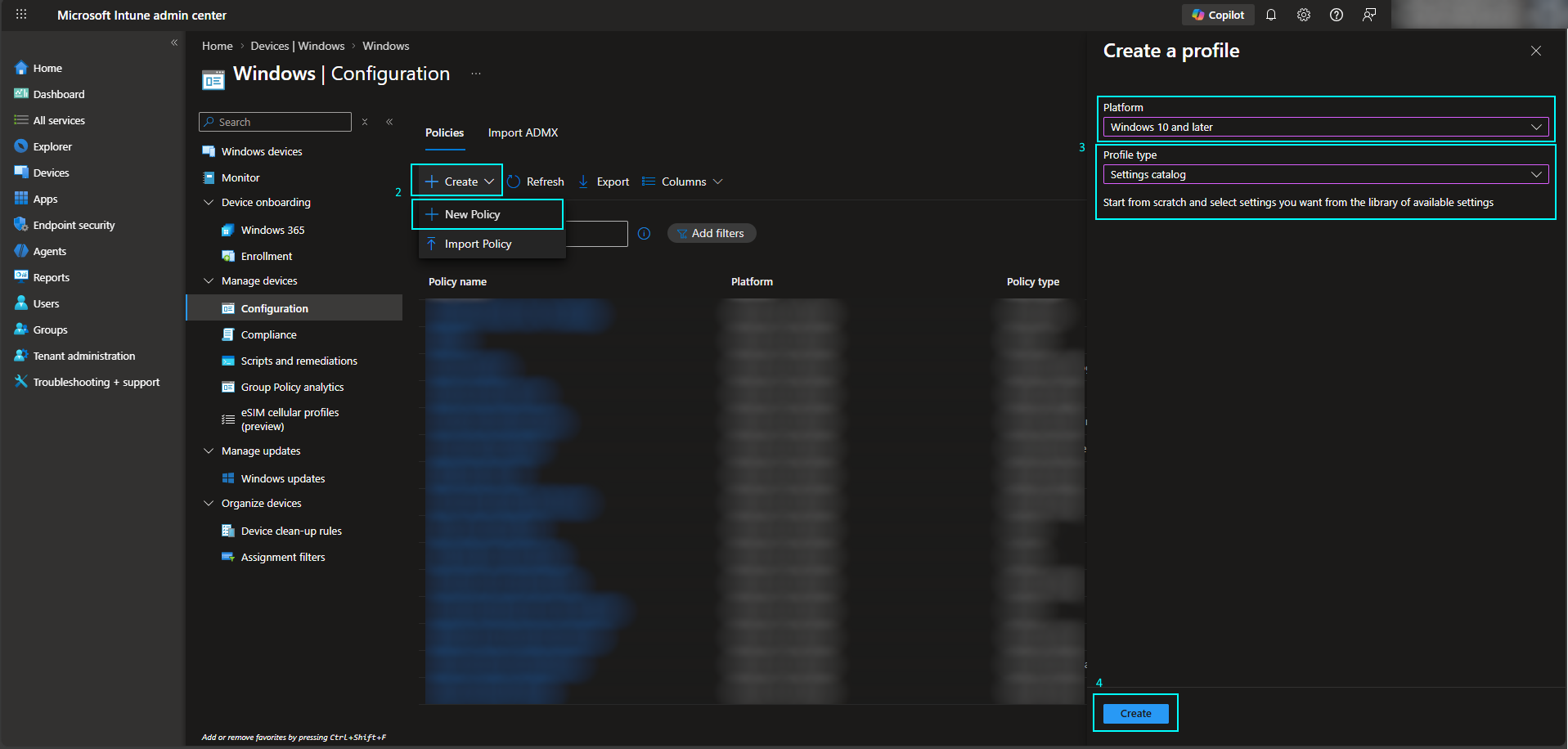 From the Intune admin portal, go to Devices > Windows > Configuration
