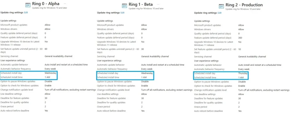 Microsoft delivers Windows updates on the second Tuesday of every month, also known as patch Tuesday. In the example above, I apply updates to my Alpha and Beta group on Wednesday, and then my production group on Thursday. This allows a couple of days for issues to be reported before the updates are applied to my production group.